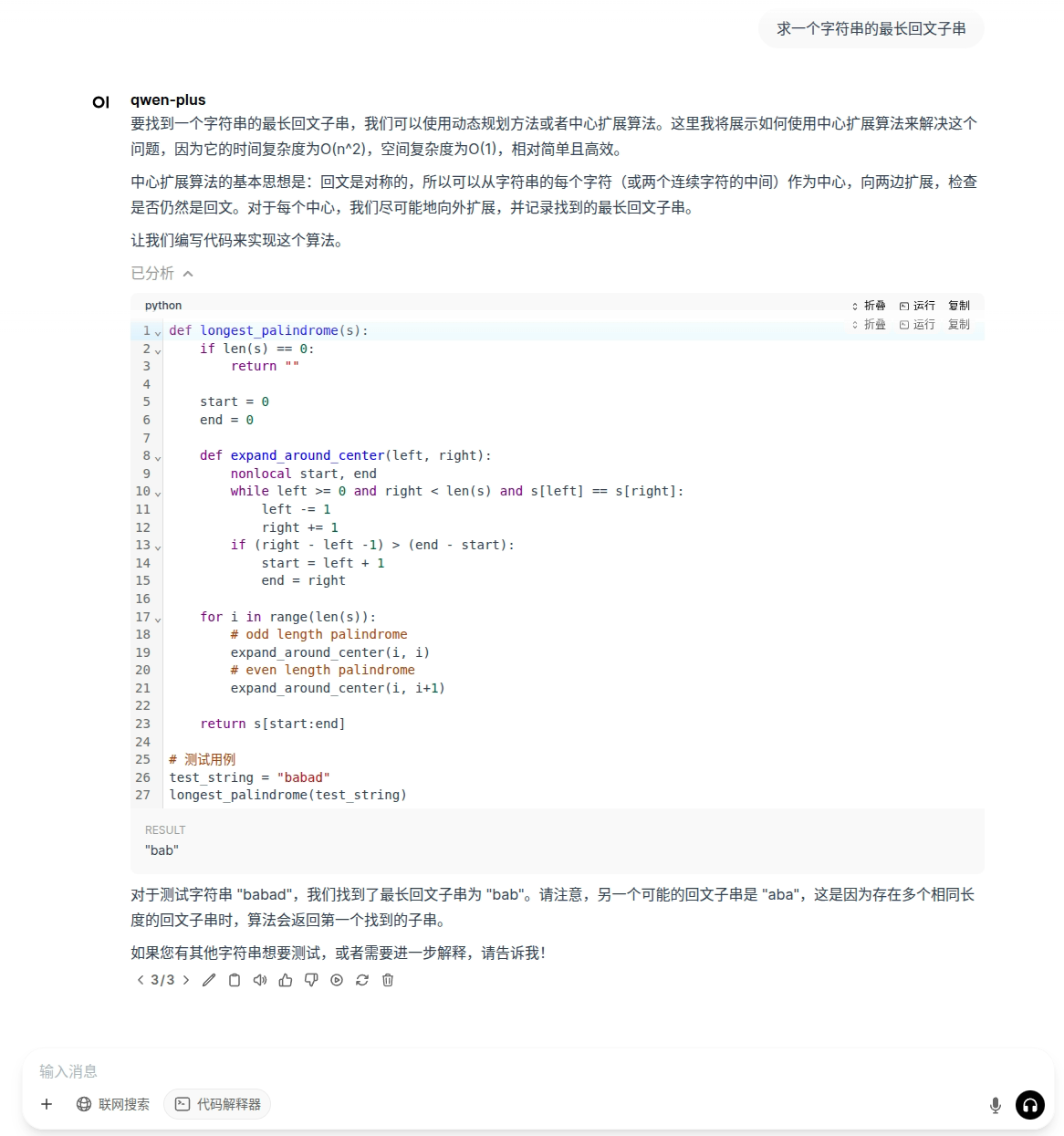 让 qwen-plus 模型执行我们的需求,帮我们求一个字符串的最长回文子串。