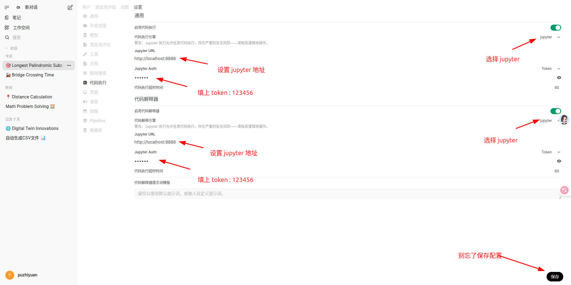- 使用 jupyter ,开启代码执行和代码解释,选择 jupyter。