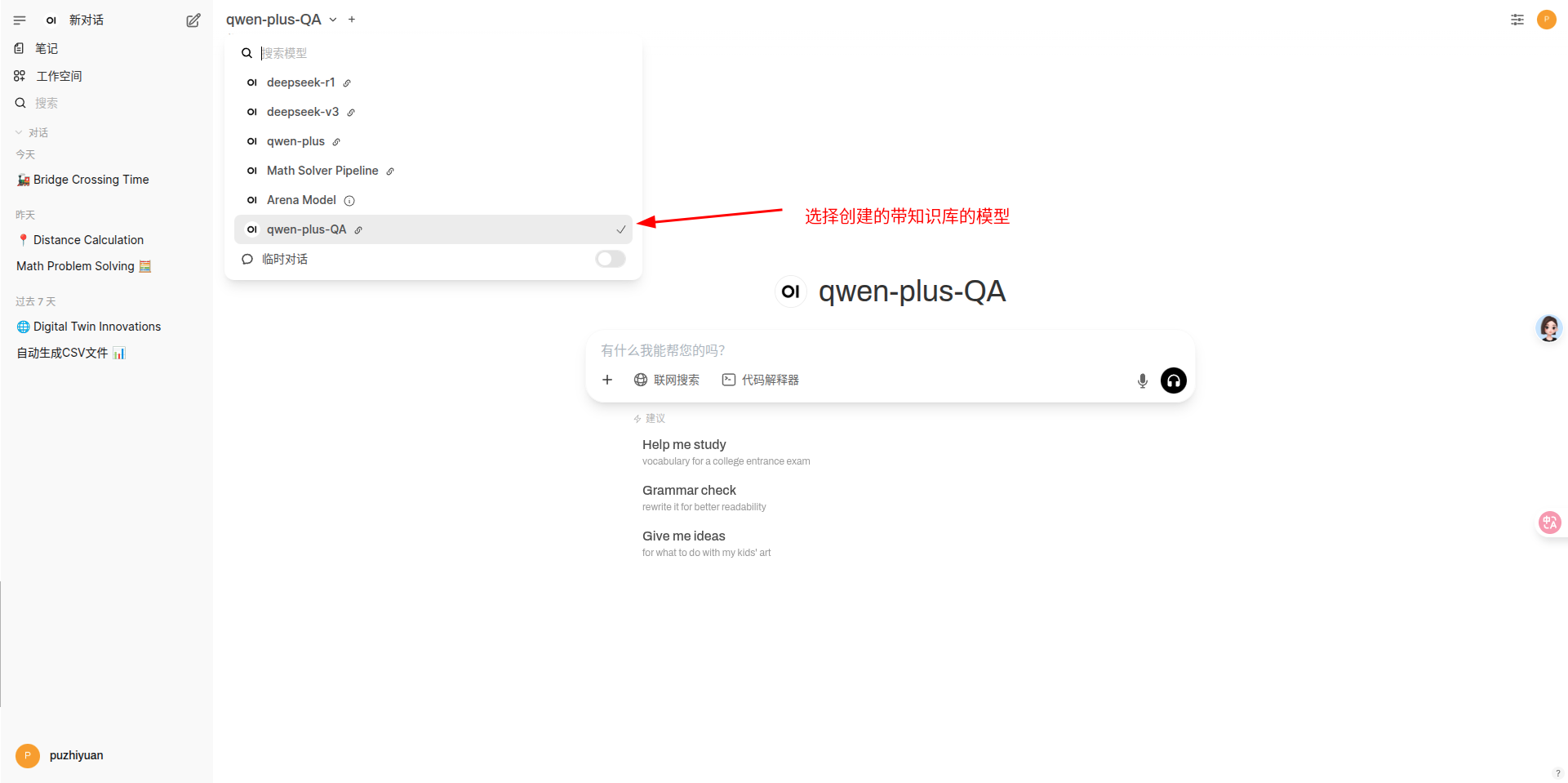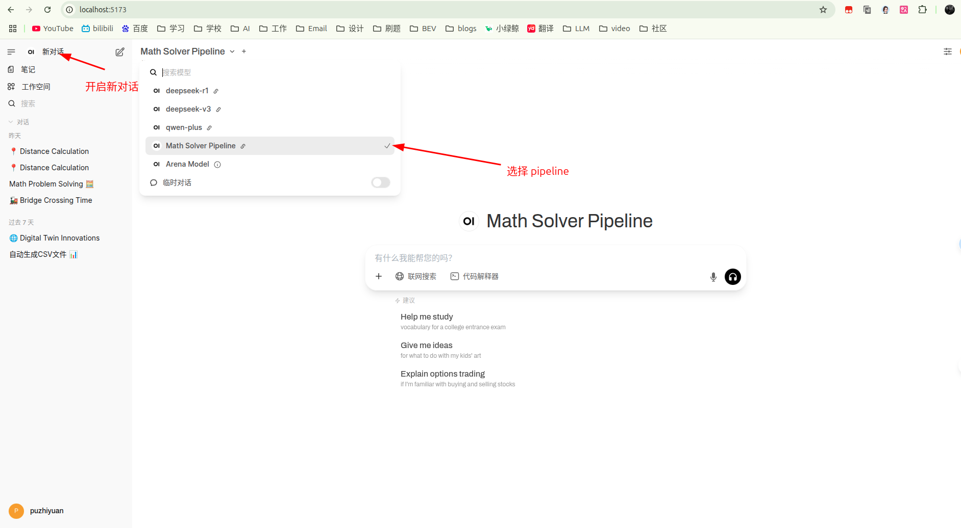 - 开启新对话并选择定义好的 pipeline ,此时就可以愉快的使用了。