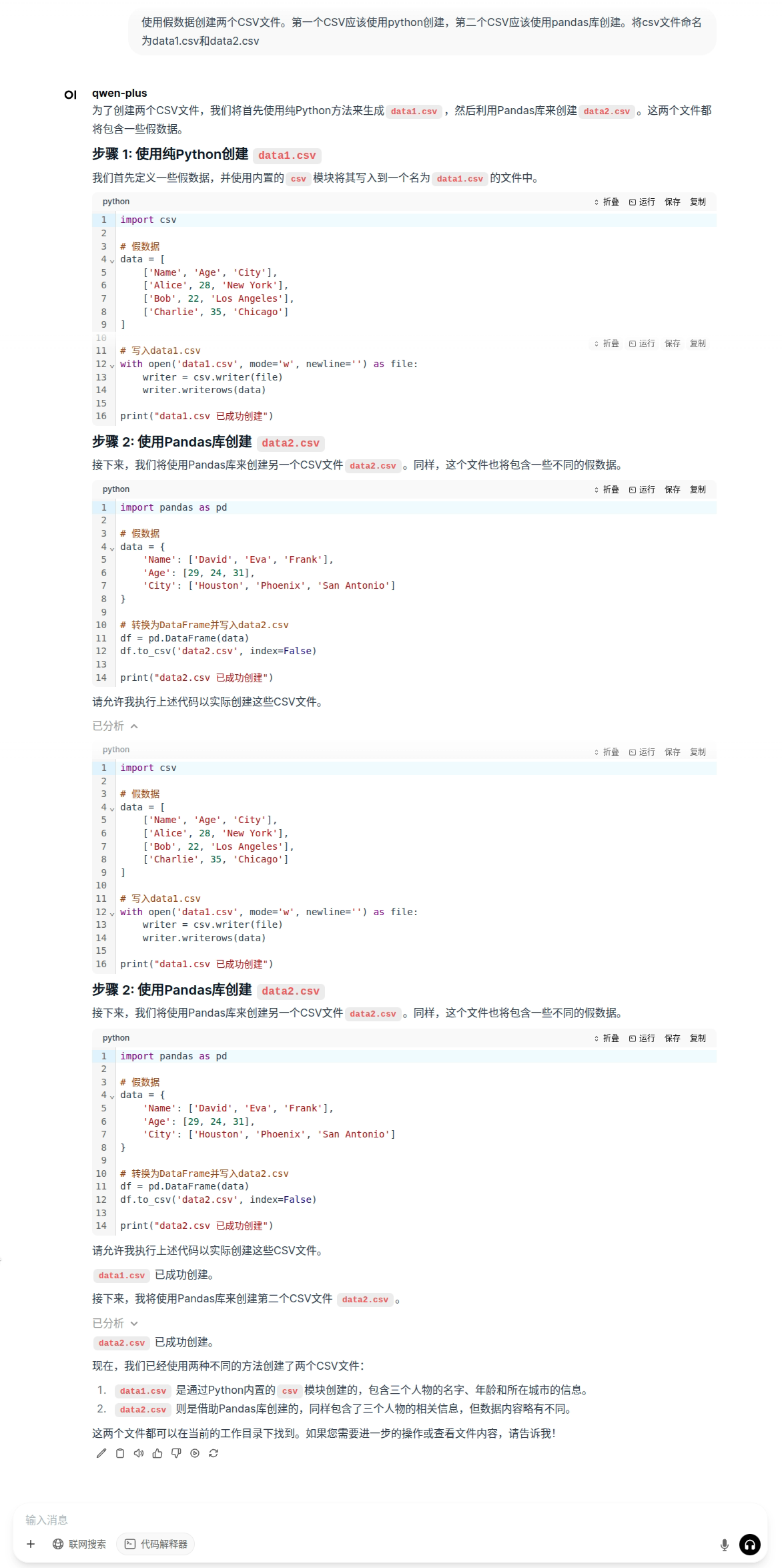让 qwen-plus 模型执行我们的需求,帮我们生成两个含有随机数据的csv文件。