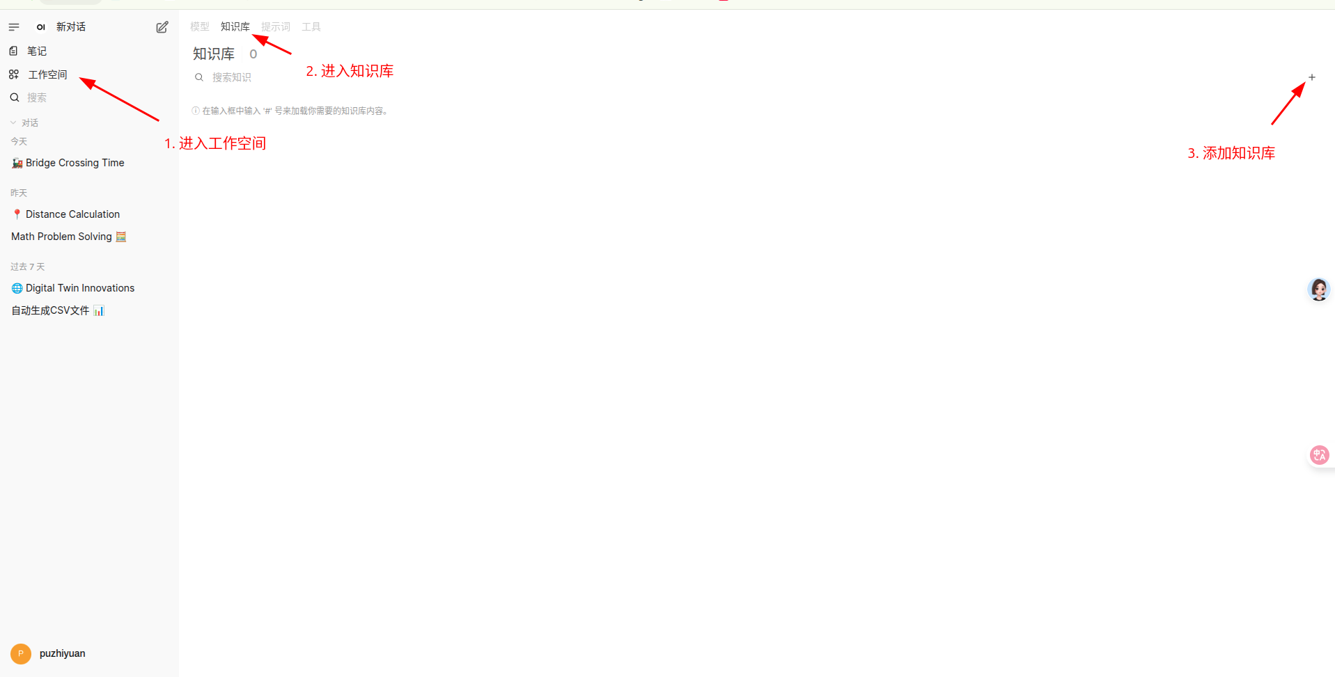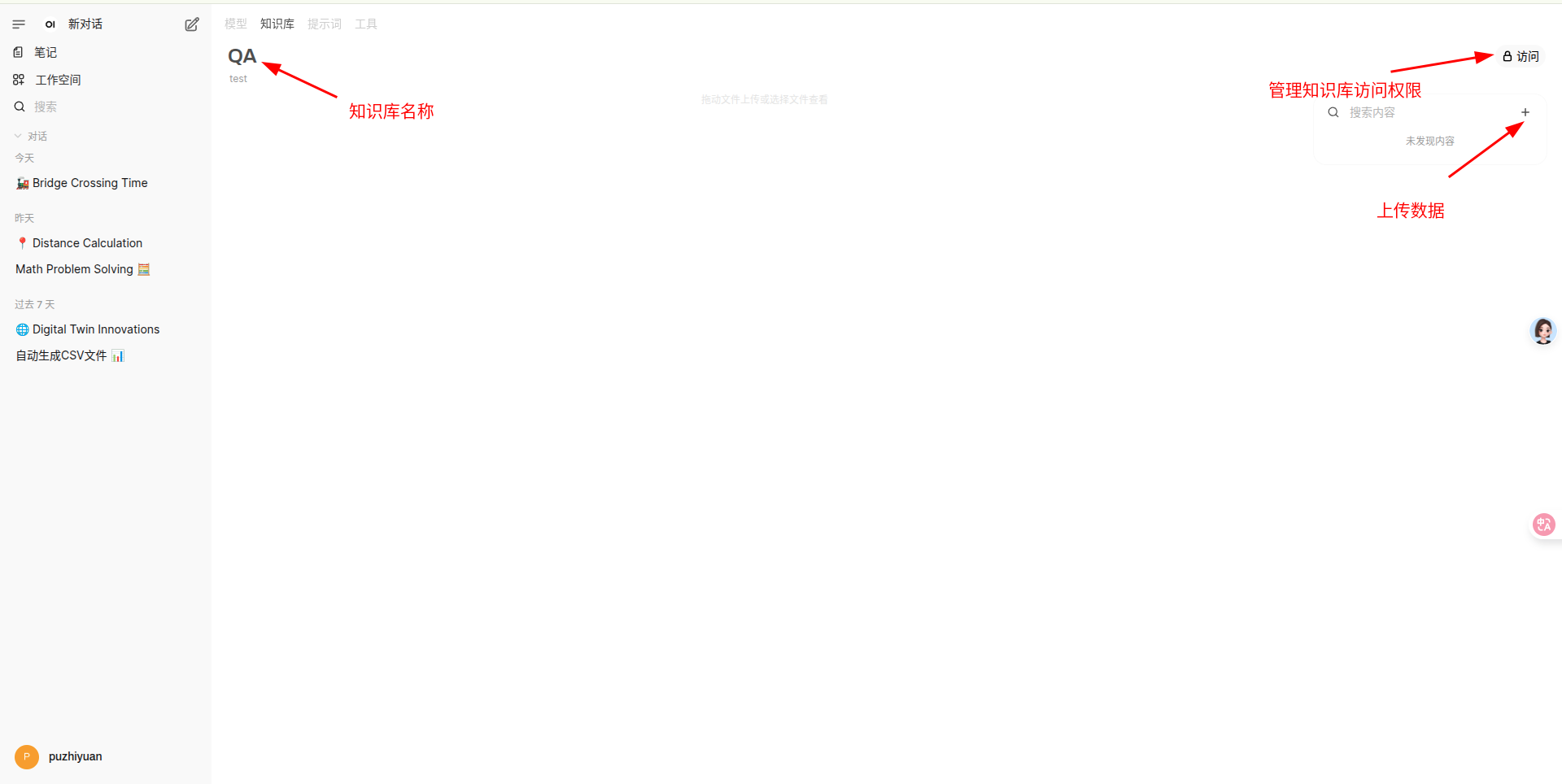 导航到 工作空间->知识库 中,创建知识库并上传数据。