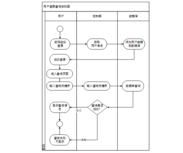 用户注册登录,系统从数据库获取用户数据信息,登录成功用户进入查询页面,用户输入查询关键字,数据库查询用户所输入的关键字,查询成功显示查询的模块信息,查询失败不显示。用户登录查询功能的活动图如图3-3所示。