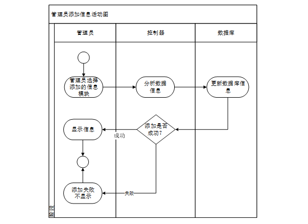 此活动图描述了管理员添加信息。管理员可以通过信息管理模块页面选择要添加的基本信息。添加成功传入数据库中,失败则不添加。管理员可以保存信息并更新系统中的信息。管理员添加信息功能的活动图如图3-4所示。