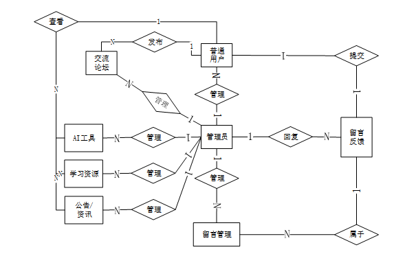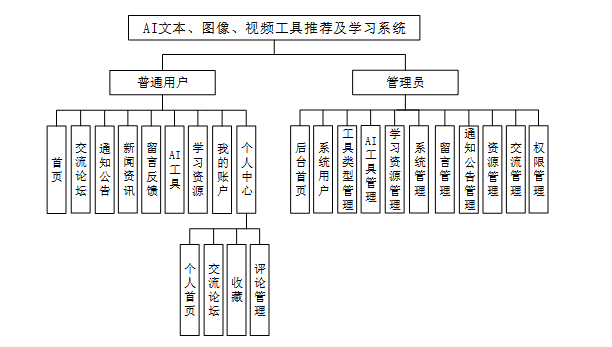 本研究采用Spring Boot作为后端框架,结合Java编程语言和MySQL数据库,构建了一个稳定、高效的系统架构。平台面向两类主要用户:普通用户和管理员。普通用户可以访问首页、交流论坛、通知公告、新闻资讯等板块,获取最新的AI技术和行业发展动态;同时,他们还能利用平台提供的AI工具进行文本、图像、视频的智能处理,并通过学习资源模块提升自己的技术水平。