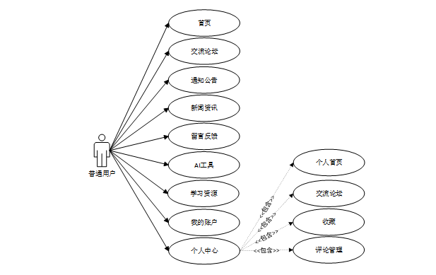 普通用户主要利用平台获取AI工具推荐、学习资源以及参与社区交流。他们通过浏览首页获取最新资讯和推荐内容,使用AI工具处理文本、图像或视频任务,并通过学习资源模块提升个人技能。此外,用户可以在交流论坛中分享经验、提出问题并参与讨论。对于感兴趣的工具或资源,用户可以进行点赞、收藏及评论,以个性化的方式管理和追踪自己的学习进度和偏好。普通用户角色用例图如下所示。