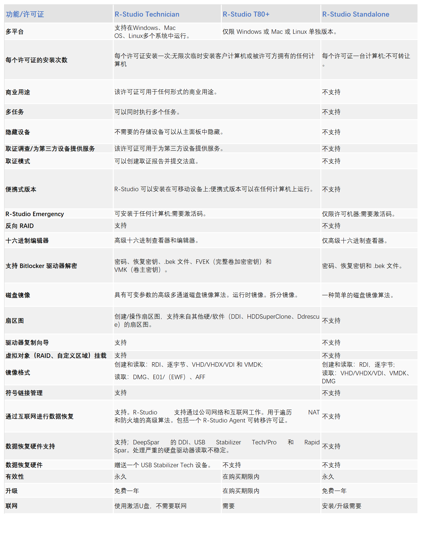 为了满足小型计算机维护和数据恢复企业以及向第三方提供商业或调查服务的个人更实惠的价格要求,现在有两种 R-Studio Technician 工具可供选择。第一个选项是著名的 R-Studio 技术员包,它附带永久技术员许可证和一年免费支持(升级/更新)服务,适用于 R-Studio 支持的所有作系统。另一个更实惠的选项 R-STUDIO T80+ 可以针对特定操作系统购买。它在购买期限内有效(至少 80 天),从激活之日起计算。T80+ 许可证绝对没有功能限制,可以在许可证到期前随时以初始差价换取 R-Studio 技术员包。