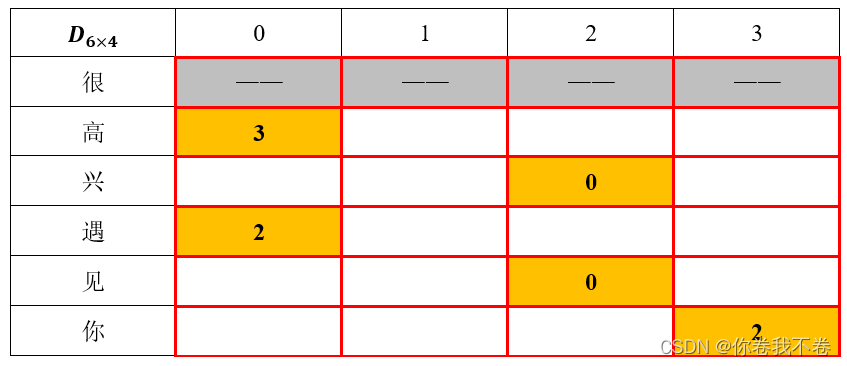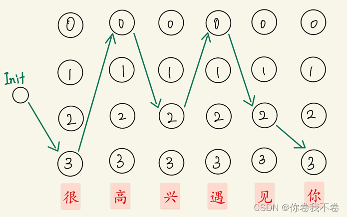 首先画出“很高兴遇到你”的状态转移图如下,图中已画出最优的状态连接。