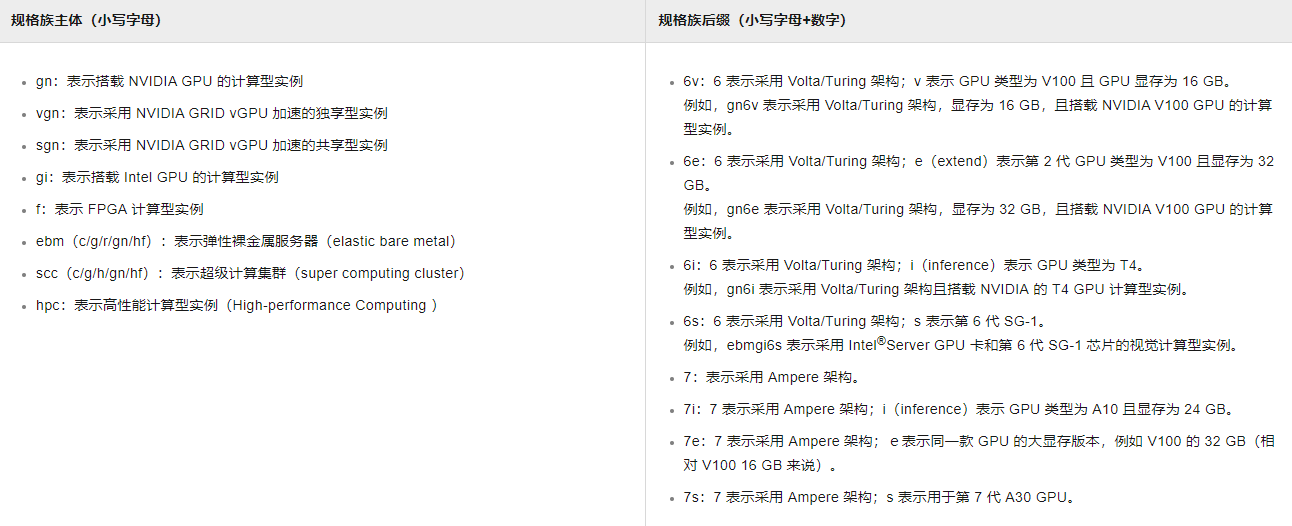 本示例以GPU计算型和GPU虚拟化型实例规格族为例,展示GPU实例规格的命名含义。