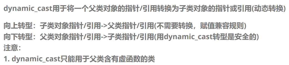 使用dynamic_cast的时候要进行转换,那么就必须要实现多态(要检查虚表里面的标识)