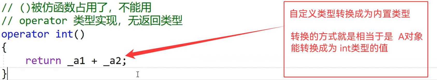 / b、内置类型和自定义类型之间// 1、自定义类型 = 内置类型 ->构造函数支持// 2、内置类型 = 自定义类型class Apublic:A(int a):_a1(a),_a2(a){}:_a1(a1), _a2(a2){}// ()被仿函数占用了,不能用// operator 类型实现,无返回类型private:int main()A aa1 = 1;