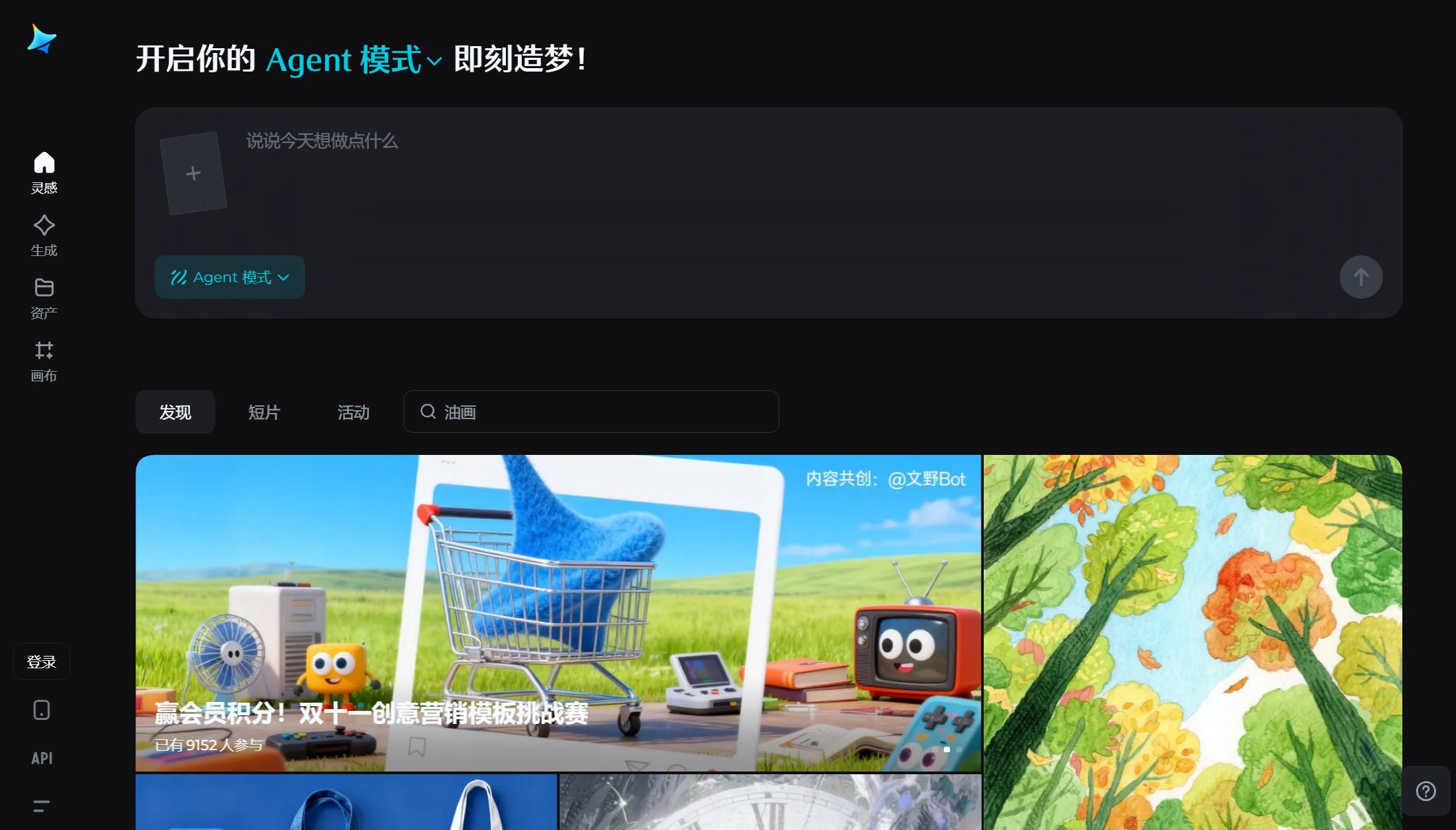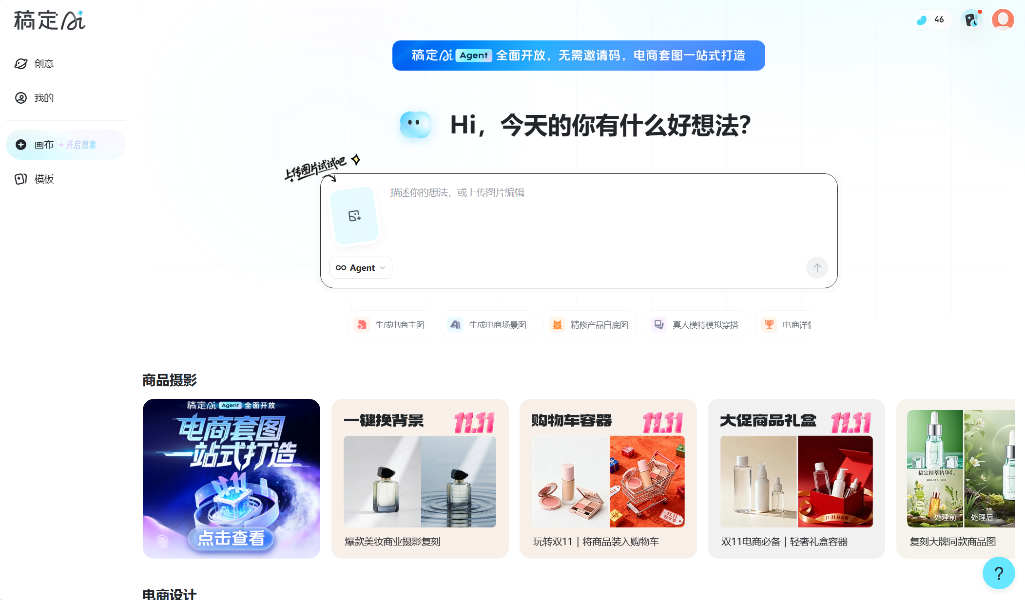 智能对话式设计:用户可通过自然语言与AI设计Agent交互,如输入"设计一个科技感十足的产品发布会海报",Agent会自动解析需求并生成多个设计方案