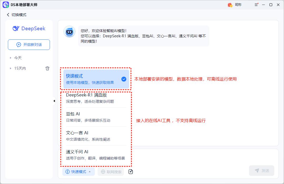 日常办公、轻量创作,建议优先选择豆包、通义千问,搭配DS本地部署大师实现本地运行,兼顾便捷性与数据安全!DeepSeek R1+DS本地部署大师,离线环境下也能完成代码开发、逻辑推理!
