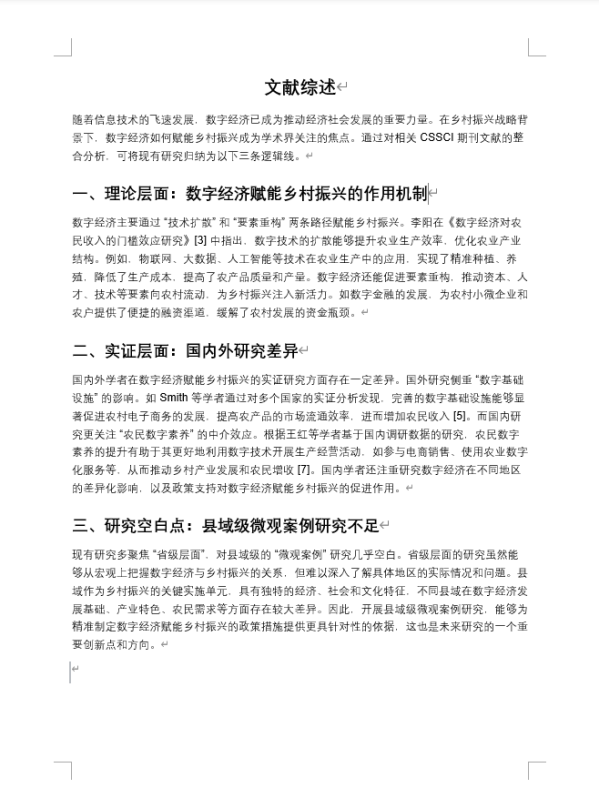 文献综述作为学术论文的核心基础,其质量直接影响研究价值。然而,初稿常因简单堆砌文献而缺乏逻辑性,例如仅罗列多篇论文摘要。通过智能工具(如AICheck)的深度整合功能,可快速实现文献综述的体系化重构。工具将8篇CSSCI期刊文献(如《中国农村经济》《农业经济问题》)自动归类为三条研究脉络:理论框架、实证比较与研究空白。理论部分聚焦数字经济赋能乡村振兴的机制,如技术扩散与要素重构,并精准引用3篇核心文献;实证层面对比国内外5项研究,揭示国外侧重数字基础设施、国内关注农民数字素养的差异;最后明确指出现有研究多集中于省级宏观分析,县域微观案例存在空白,为论文创新点提供直接依据。
