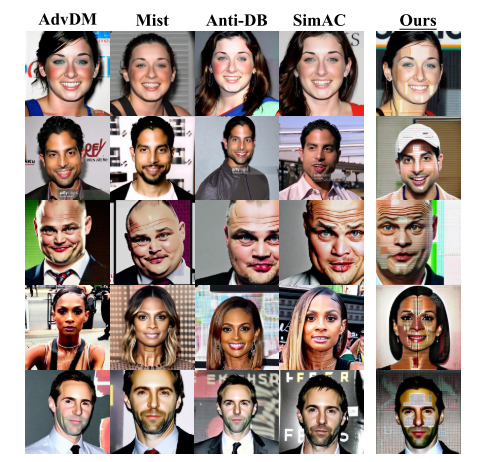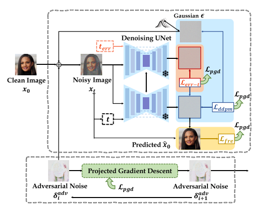 对于扩散模型,AdvDM[25]首先使用投影梯度下降(PGD)[27]来使用蒙特卡罗估计最大化潜在扩散模型的训练损失[55]。这种方法在Mist[24]中得到了进一步扩展,增加了纹理损失。Glze[41]通过攻击SD的编码器来保护图稿,而PhotoGuard[40]通过同时攻击编码器和UNET来解决未经授权的图像修复问题。朱等人。[63]利用基于GAN的生成器创建嵌入可追踪水印的敌意示例。反DreamBooth(反DB)[51]针对DreamBooth中的微调过程,引入了一种新的反向传播代理,以从干净和部分对抗性的例子中学习。在反数据库的基础上,SIMAC[52]设计了一种自适应的贪婪时间间隔选择。赵等人。[61]总结当前的挑战,提供精调方法的基准,并揭示当前技术对净化的敏感性。同时,MetaCloak[26]元学习稳健的、可转移的保护,而CAAT[57]干扰交叉注意以获得有效的、无需训练的扰动。最近,FastProtect[1]以实时部署为目标,IDProtector[47]训练一次通过编码器来防御生成。