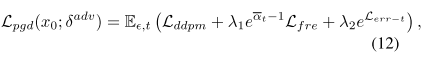 如图6所示,我们的攻击将Lfre和Lerr−t指导与Vanilla Lddpm结合在一起。为了平衡不同训练目标的数值范围,PGD中用于坡度上升的总损失可表示为: