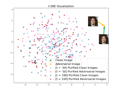 图2.T-SNE[50]可视化(困惑=10)使用DiffPure[31]获得的4×100纯净图像,对于干净图像和对抗性图像具有不同的时间步长。