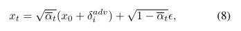 具体地说,在pgd的第i步,给定干净的图像X0∈Rc×H×W、高斯噪声ϵ和对抗性噪声δadv i,我们在Adv.Images干净图像时间步t处扩散噪声对抗性样本Xt如下: