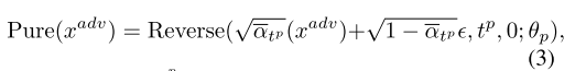 基于扩散的净化的开创性工作DiffPure[31]在时间步长tp对输入的敌意图像进行扩散,并将其去噪回到净化图像。在简化的离散DDPM形式中,这可以写为: