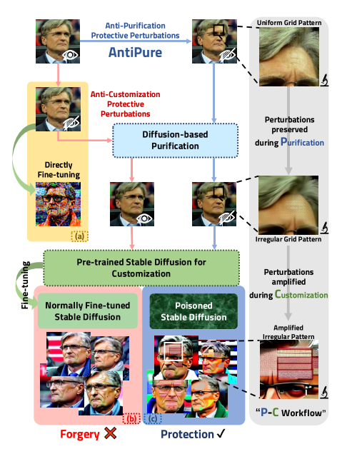 图1.“净化-定制”工作流概述图a)。保护性扰动使用小噪声来扭曲微调扩散模型的输出。b)。然而,现有的方法可以通过基于扩散的纯化来去除。c)。我们提出了一种简单的诊断方法,称为AntiPure,它实现了抵抗净化的保护性扰动,并使定制输出更具区分性。