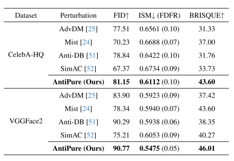 量化指标。对于定制的输出,我们首先使用FID[13],这是生成性任务中的一种通用度量,它使用先启v3[49]量化合成图像和真实图像的特征分布之间的距离。此外,我们还包括来自Anti-DB的指标[51]。由于我们的主要目标是生成非真实感人脸,因此我们使用流行的ArcFace识别器来评估合成图像的面部特征与对应身份的真实特征之间的余弦相似性[6]。我们还报告了使用RetinaFace检测器的人脸检测失败率(FDFR)[7],测量ISM评估中排除的无法检测到的人脸的比率。此指标仅用于为ISM提供更全面的参考,因为如前所述,在净化后产生完全扭曲的面部是不可行的。最后,我们使用了一种额外的无参考图像质量评估度量,BRISQUE[28],这是一种经典且流行的方法来衡量生成的图像质量。对于扰动本身,提供了一个重建度量LPIPS[60]来评估人类感知的差异。当我们专注于破坏净化后的SD的输出时,更高的FID,更低的ISM和更高的BRISQUE意味着对抗效果的增加。此外,较低的LPIPS意味着更多的不可察觉的扰动。