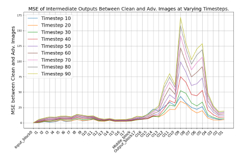 图4.在不同的时间步长上,在不同的UNT区块上的清洁样本和对抗性样本之间的中间输出的均方误差。详情见附录B.2。