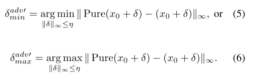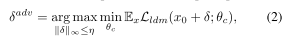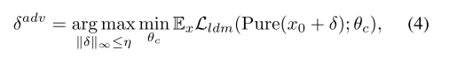 是限制在半径为L∞的Lη球内的对抗性摄动。在实践中,我们经常简化公式。公式(2)利用I-FGSM[22,23]或投影梯度下降法[27]等白盒方法,最大化Lldm以逼近最优δadv。