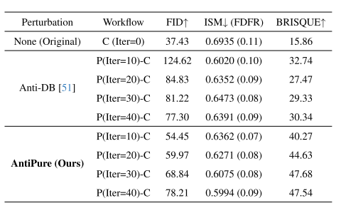 表3.在CelebA-HQ的P-C工作流程之后,不同净化迭代的DreamBooth[38]输出图像质量的比较。