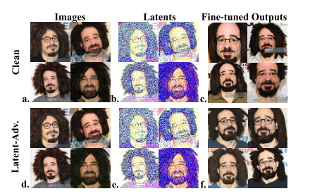 图3.对DreamBooth[38]的攻击要困难得多。与普通像素空间攻击(a.→d.)不同,潜在空间攻击(b.→e.)无法以易受攻击的VAE编码器为目标。这里,d.(译自e.)仅用于可视化目的;在我们的实验中,我们在微调过程中将B.直接替换为E.