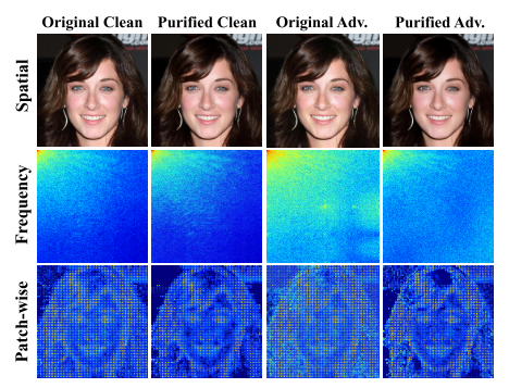 图7.DDPM净化前后空间和频域的差异。将伪彩色变换应用于DCT频谱图以获得更好的可视化效果。