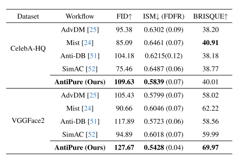 在选项卡中。1,在两个数据集的所有指标中,AntiPure都实现了最佳性能。经过充分的纯化后,以前的方法的效果明显降低,但可以更好地保留AntiPure的效果。更重要的是,虽然这些方法依赖于各种定制配置,但AntiPure只专注于相对简单的纯化过程。另一方面,由于JPEG压缩引起的扰动图像退化,CelebA-HQ上的结果明显比VGGFace2上的结果差,即使考虑到潜在的域间隙。