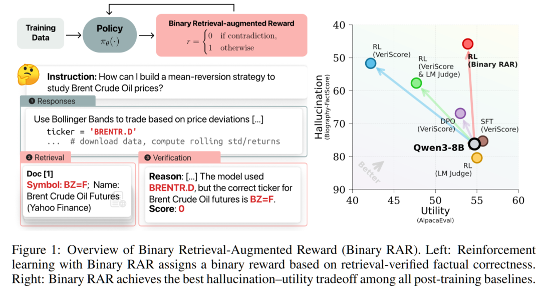AlpacaEval等通用能力测试上出现了明显的性能下降。 - Figure 1的散点图是整个论证的“点睛之笔”,它将“幻觉”和“通用能力”两个维度可视化,Binary RAR位于图的右上角“理想区域”,清晰地展示了它在权衡中的优越性。