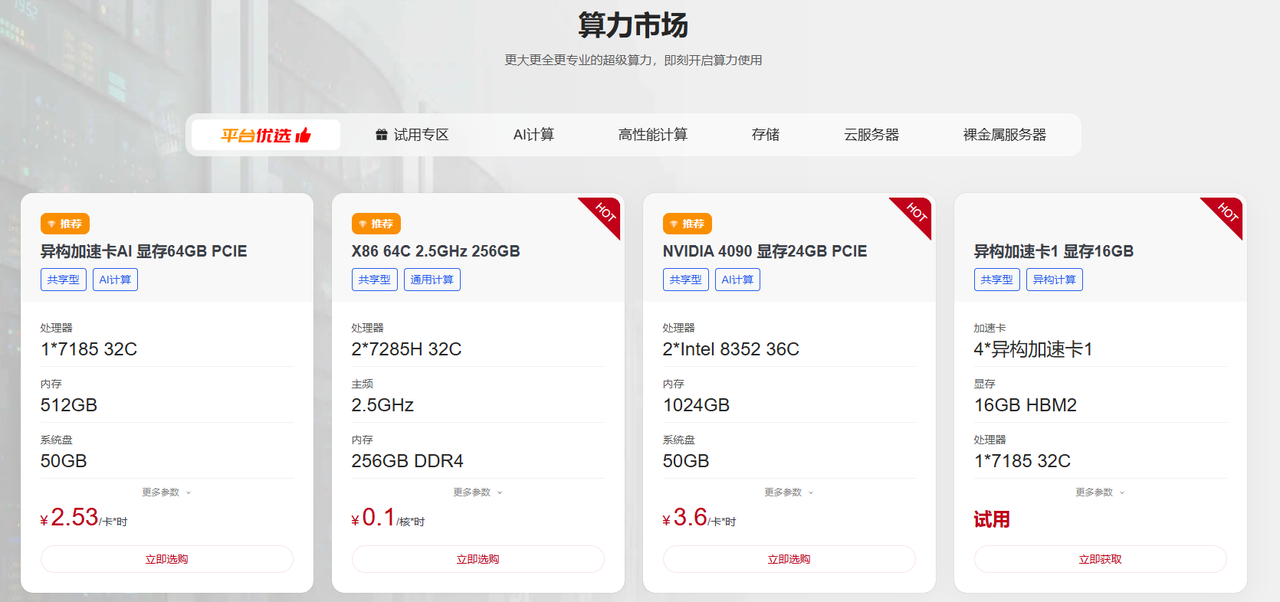 超算互联网是一个集成了算力、数据、模型三大要素的智能生态系统。我们提供自助获取 AI 算力的服务,让您根据需求灵活调整计算资源;同时,提供业内通用数据集,助您快速开展科研工作;更有一键部署热点大模型运行环境的功能,让您轻松驾驭最前沿的 AI 技术。