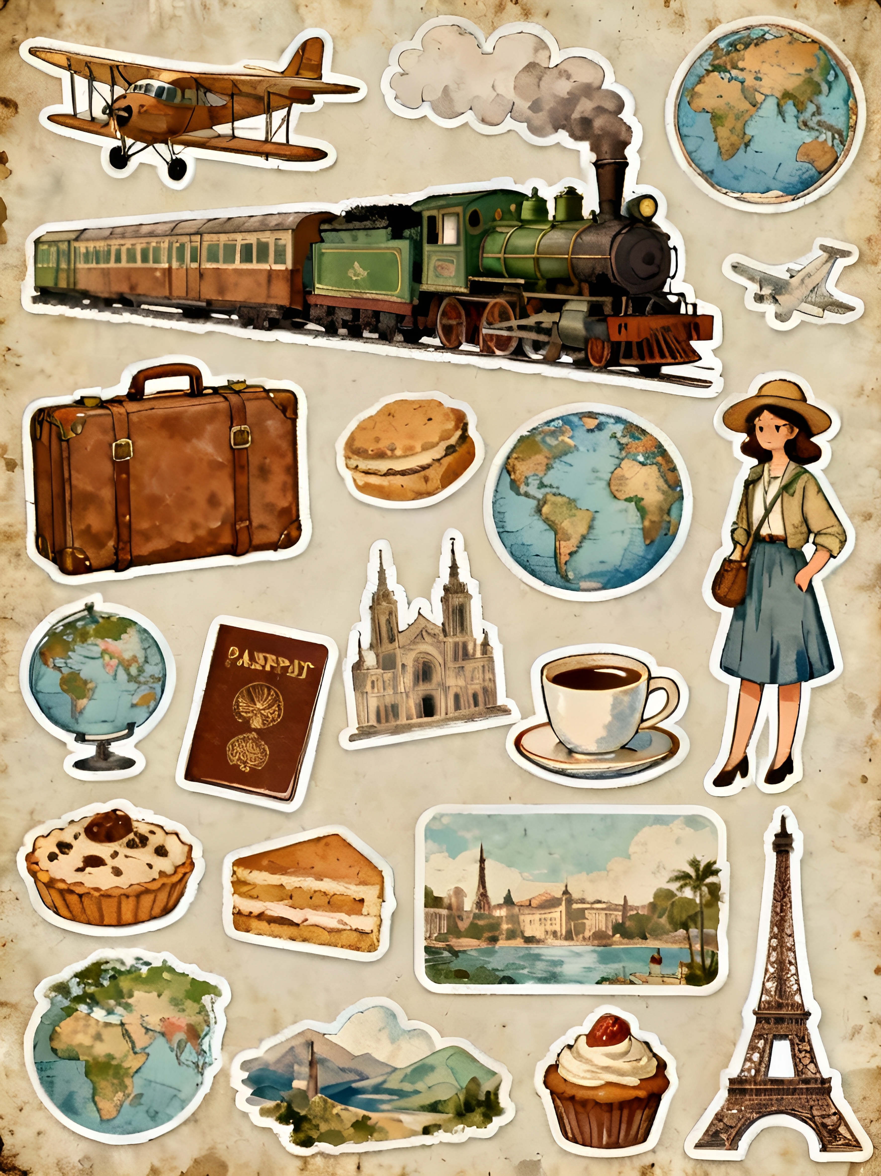 复古旅行主题贴纸合集,扁平化插画风格,暖棕 + 柔和蓝绿配色。包含复古飞机、蒸汽火车、戴帽旅行女孩、老式行李箱、咖啡杯、护照、地标建筑(埃菲尔铁塔等)、山水风景、甜点元素,边缘带白色贴纸轮廓,整体呈现温馨怀旧的环球旅行氛围,细节丰富,风格统一。