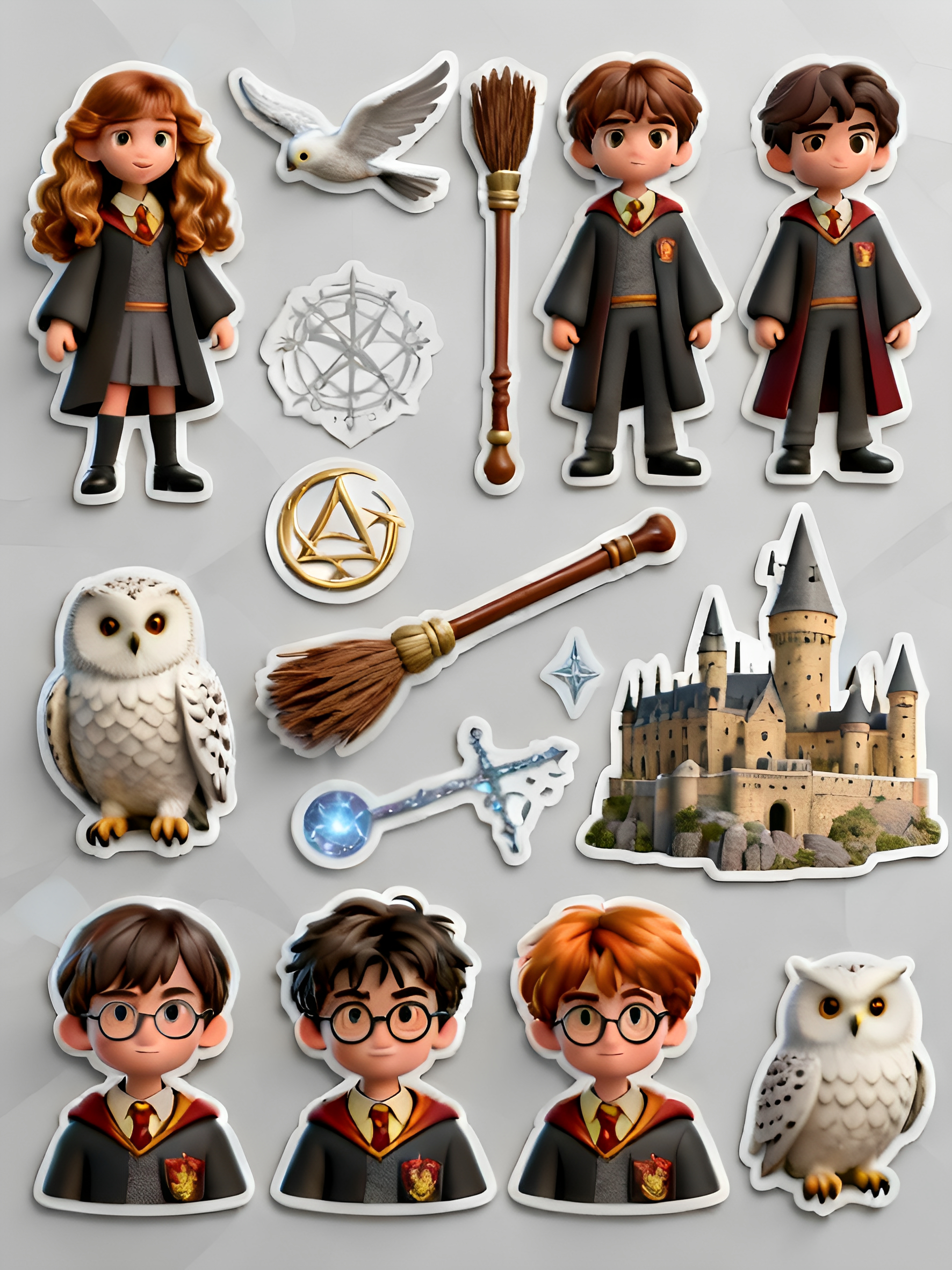 哈利波特主题 iOS 风格 emoji 合集,3D 卡通渲染,角色包含哈利、赫敏、罗恩等经典人物,搭配飞天扫帚、霍格沃茨城堡、猫头鹰等元素,整体风格统一,色彩细腻,突出 IP 辨识度,呈现科技感与魔法世界的融合感,细节高清