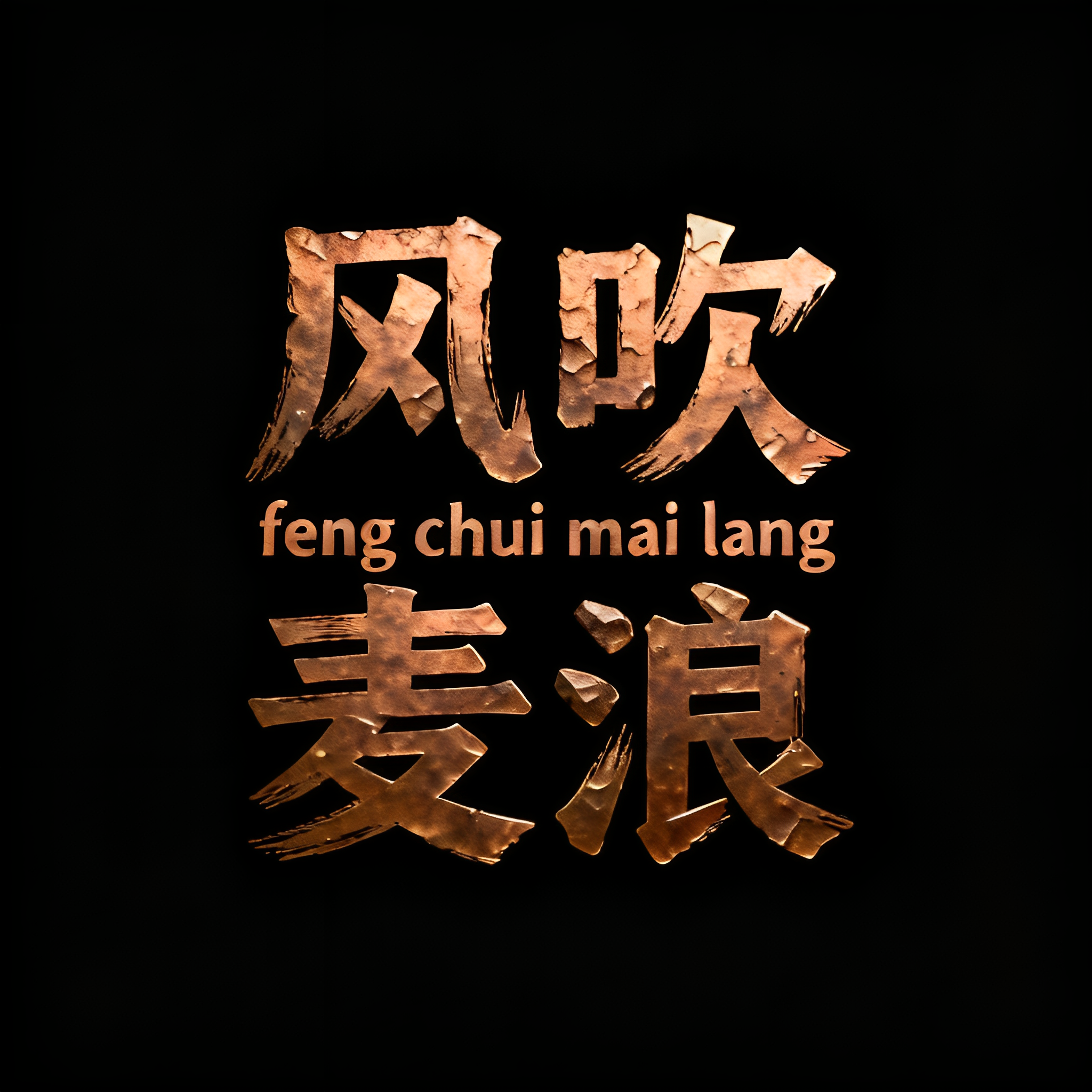 黑色干净背景,青铜器金属质感文字“风吹麦浪”,神秘感,粗矿毛笔字,附带英文“feng chui mai lang”。