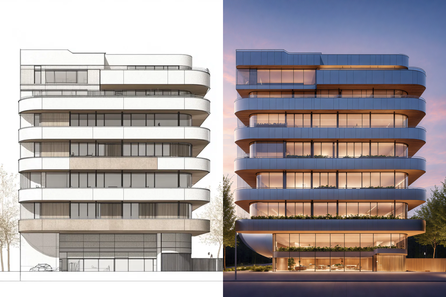 识别原建筑形态的基础上,智能进行外立面优化与风格再造。设计师只需上传一张建筑原图,描述想要的风格。无论是现代极简、城市复古,还是绿植生态风,AI都能自动生成多套翻新方案,兼顾结构保留与视觉创新。