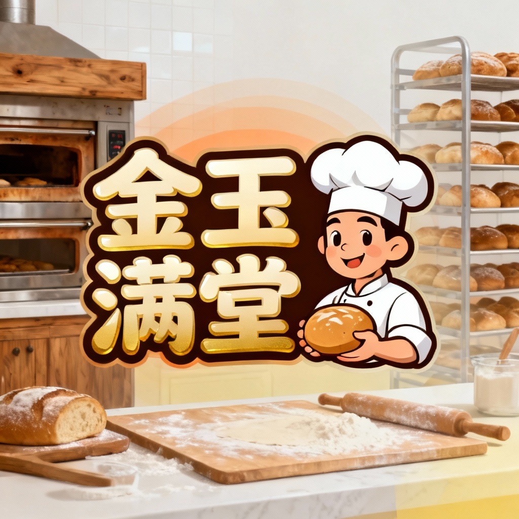 背景是一张烘焙店,透明度低,设计一个名称为”金玉满堂“的蛋糕烘焙的logo店,艺术字体。字体要大,logo画面居中。并且有一个烘焙卡通人物画像作为形象。