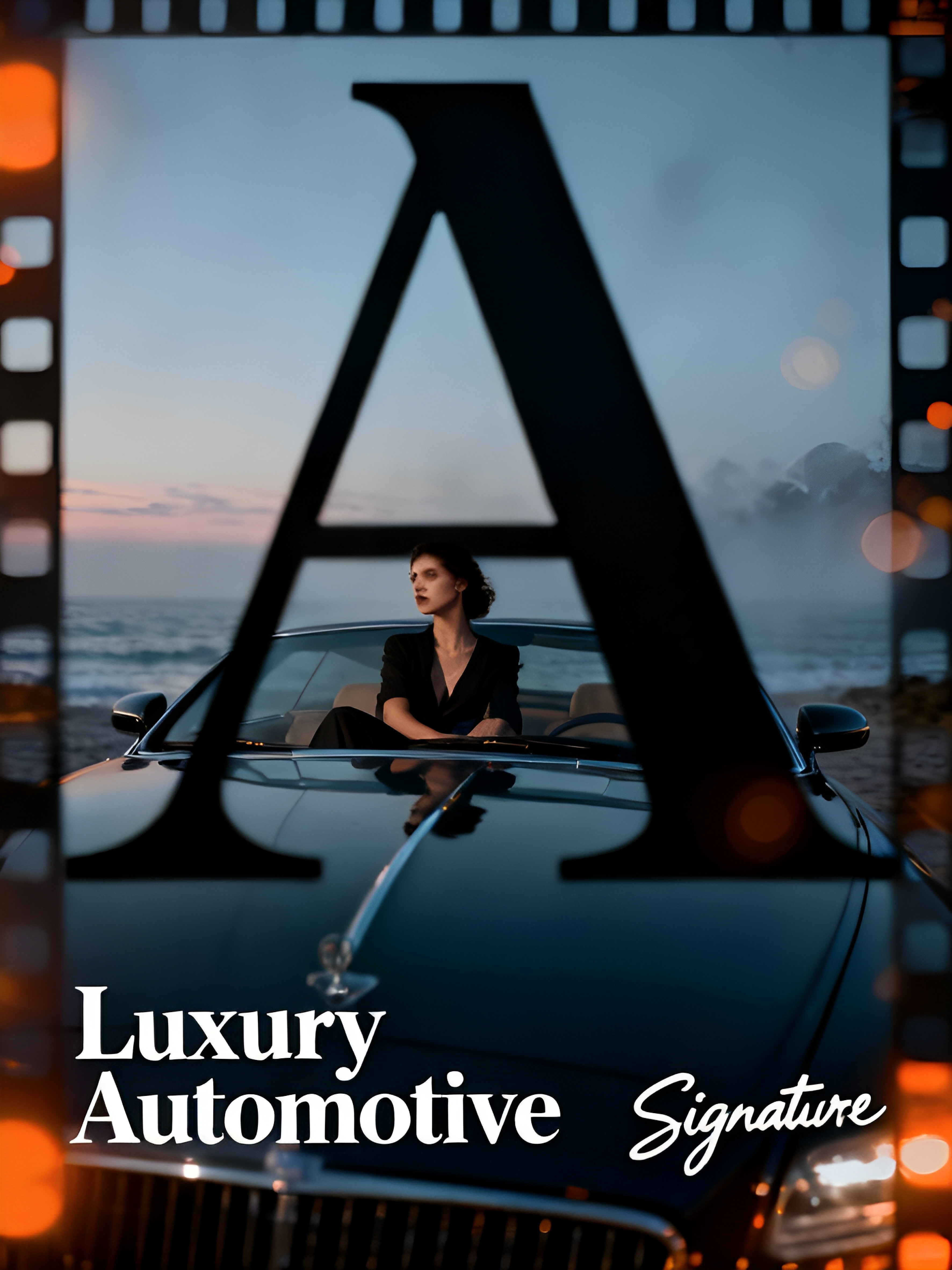 怀旧创意,夸张构图,低角度仰拍,胶片摄影,A形,女生人像,时尚,豪车,蓝灰,橙色,微光,泛暗,余晖,海边,强透视,浅景深,漏光,朦胧美学,情景氛围感,超现实,文字手签+英文信息解析排版点缀。