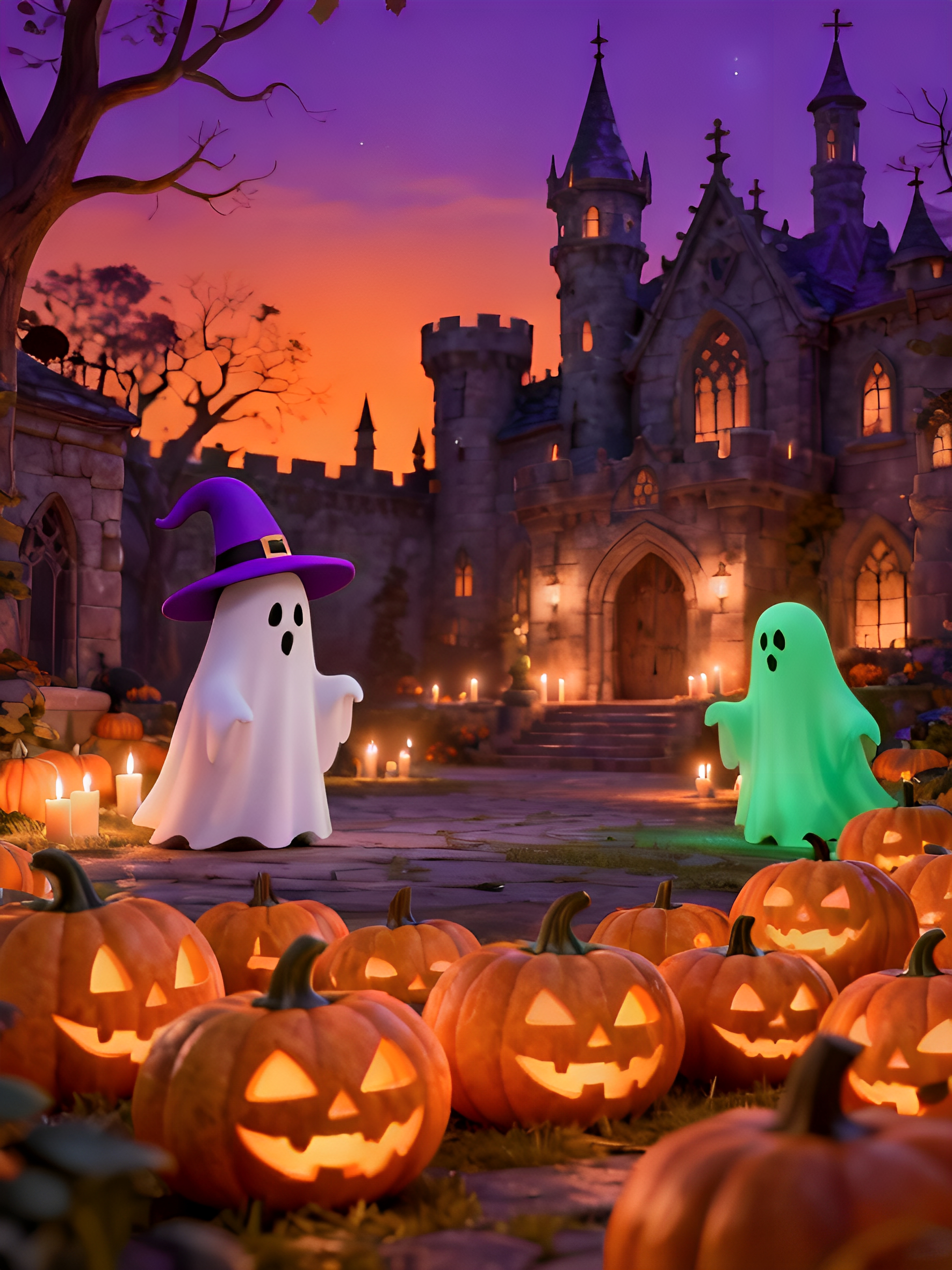 3D 卡通渲染,万圣节主题,紫帽幽灵、绿幽灵、南瓜灯群,哥特古堡庭院夜景,蜡烛暖光,紫橙渐变,高清细节,奇幻温馨氛围。