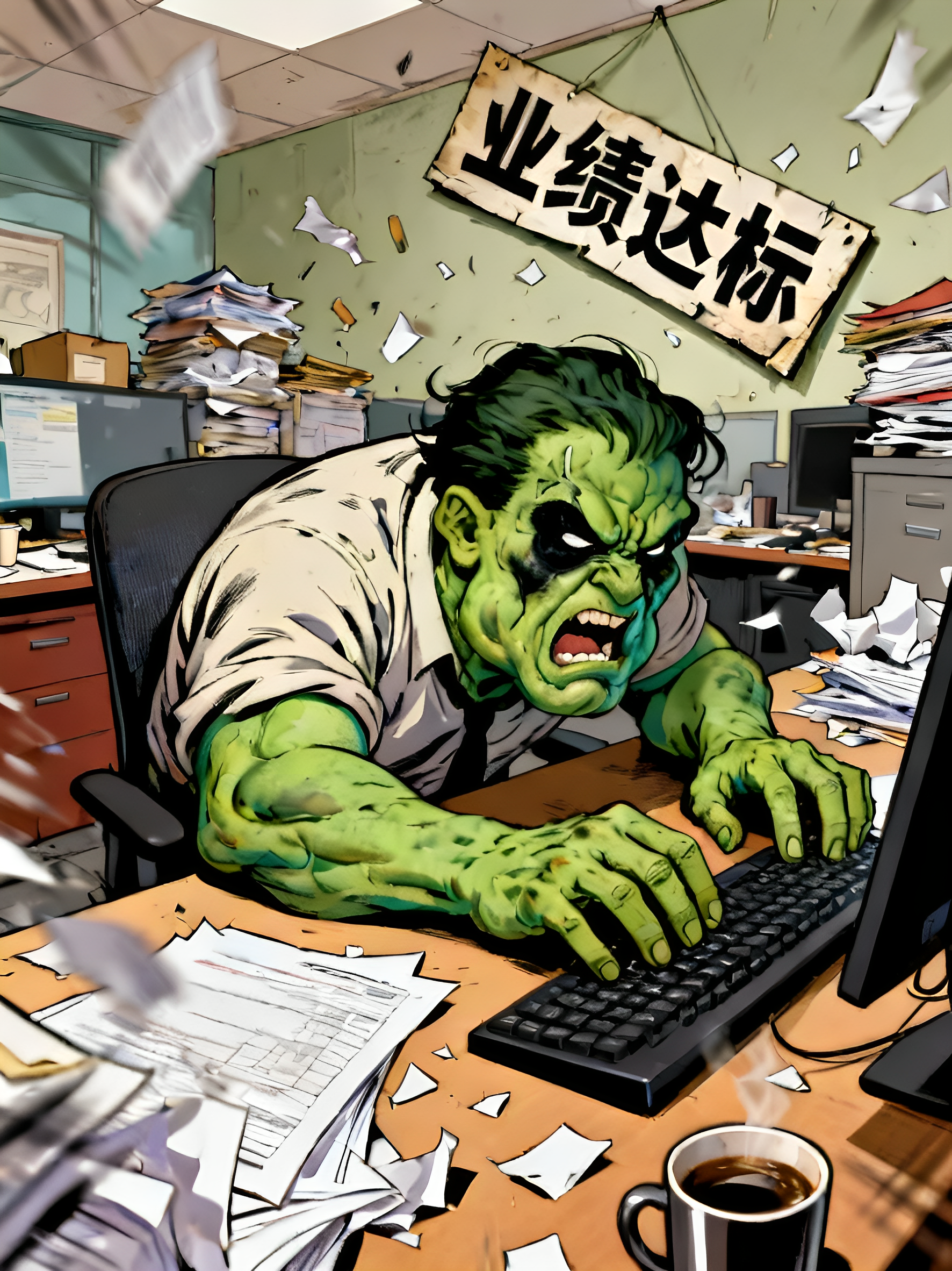 抽象,丑陋的一个男职员,表情愤怒,黑眼圈严重,正在工位上面疯狂打字,夸张,彩色