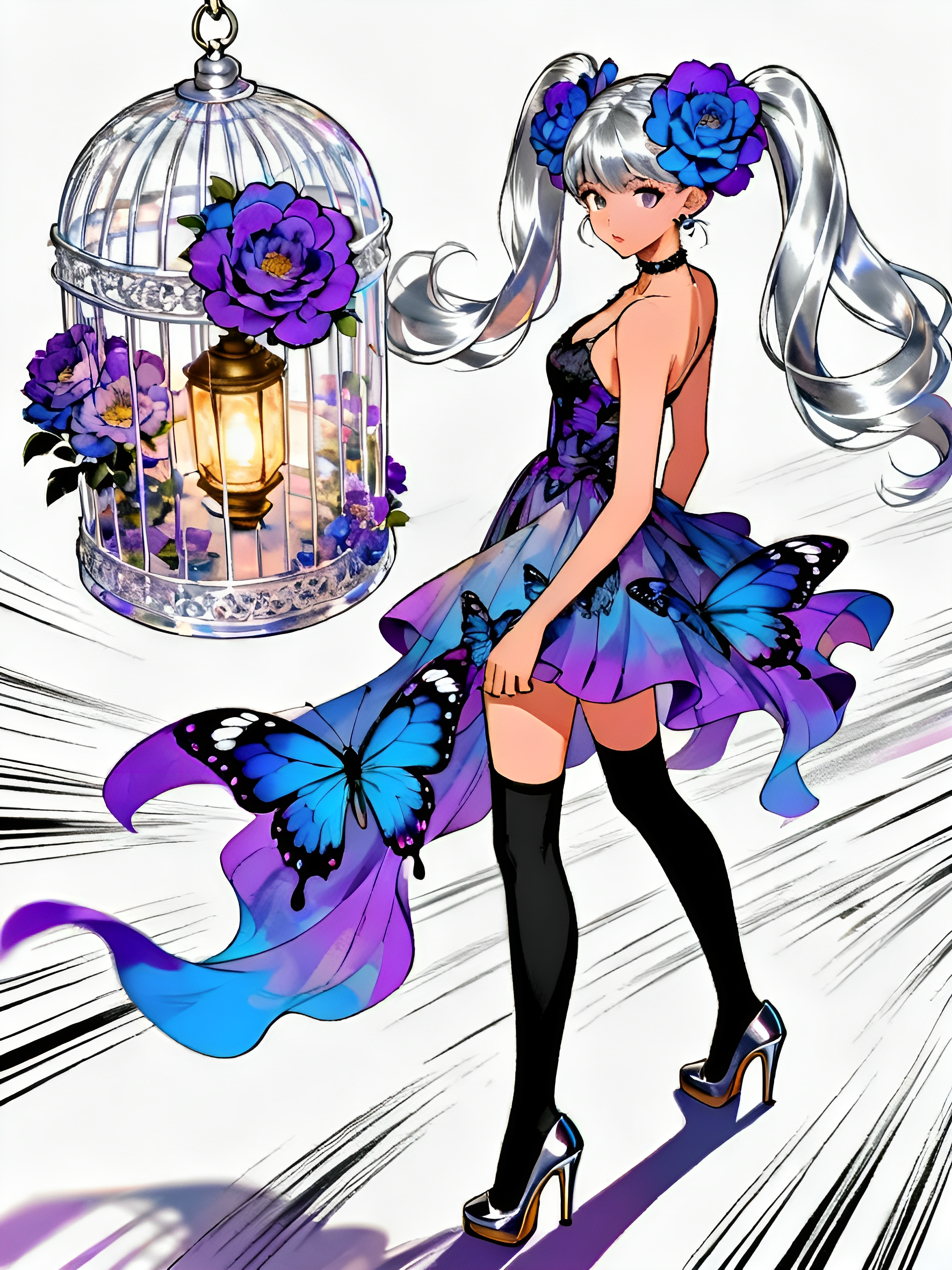 二次元美少女角色设计,银发双马尾搭配蓝紫色花卉发饰,身着蓝紫渐变带蝴蝶纹样的优雅礼裙,搭配黑色过膝袜与精致高跟鞋,姿态优雅。背景是装饰着花朵的透明鸟笼,旁悬复古笼灯,环绕彩色蝴蝶与淡紫色花卉,风格细腻梦幻,色彩层次丰富,突出奇幻优雅氛围,细节如服饰纹理、蝴蝶形态高清呈现。