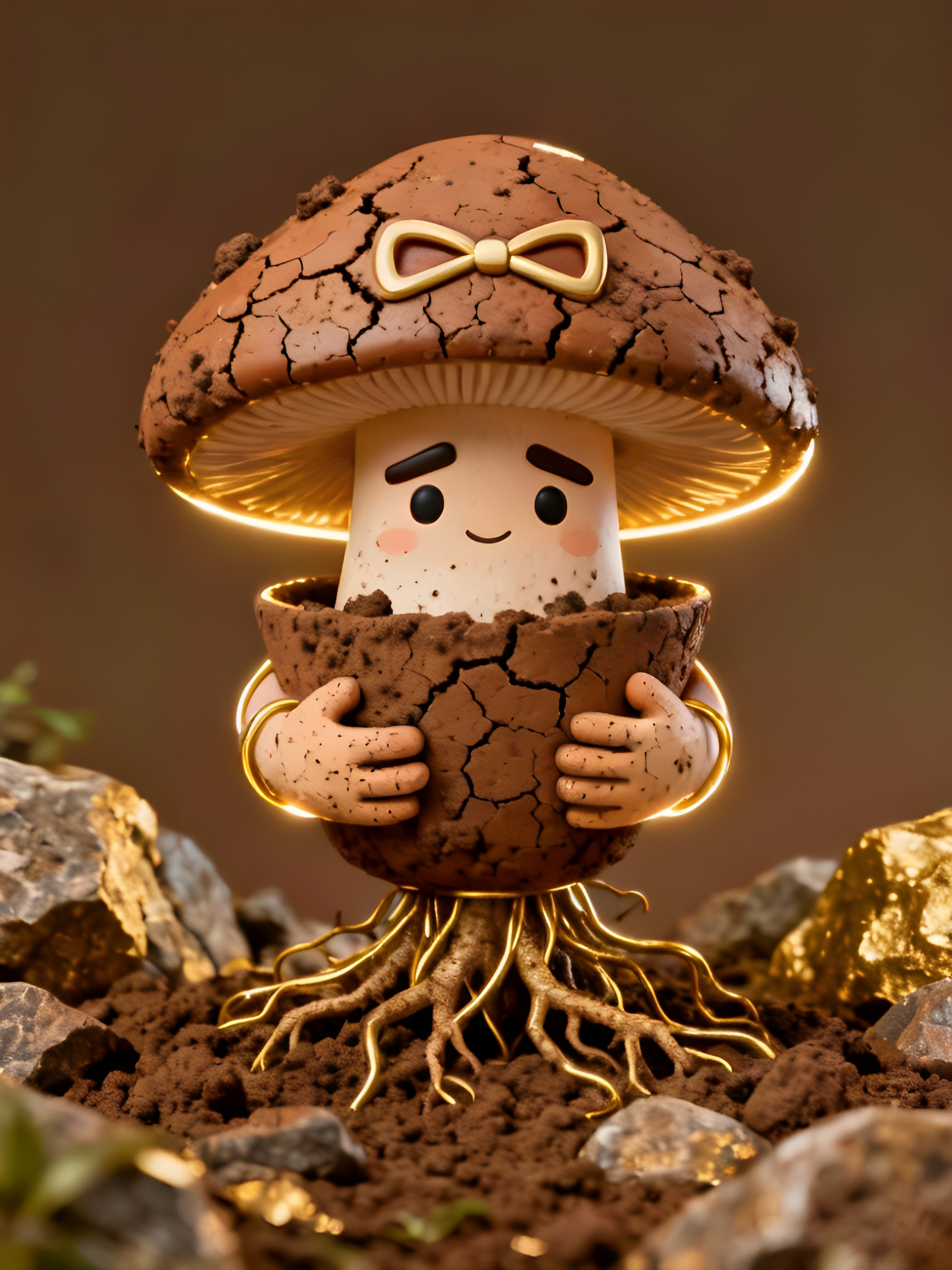 蘑菇形象的盲盒,低头垂眉,双手抱着一个小蘑菇,其帽顶纹理如同开裂的泥土,并带有金色纹路,扎根于岩石地形之上,整体色调以土褐和金黄为主,具有自然主义的幻想风格,给人以保护和滋养之感。 治愈系奇幻潮玩,精细3D渲染,柔和光影,高级色彩搭配 · 质、自然元素融合、发光效果、情绪化表情。