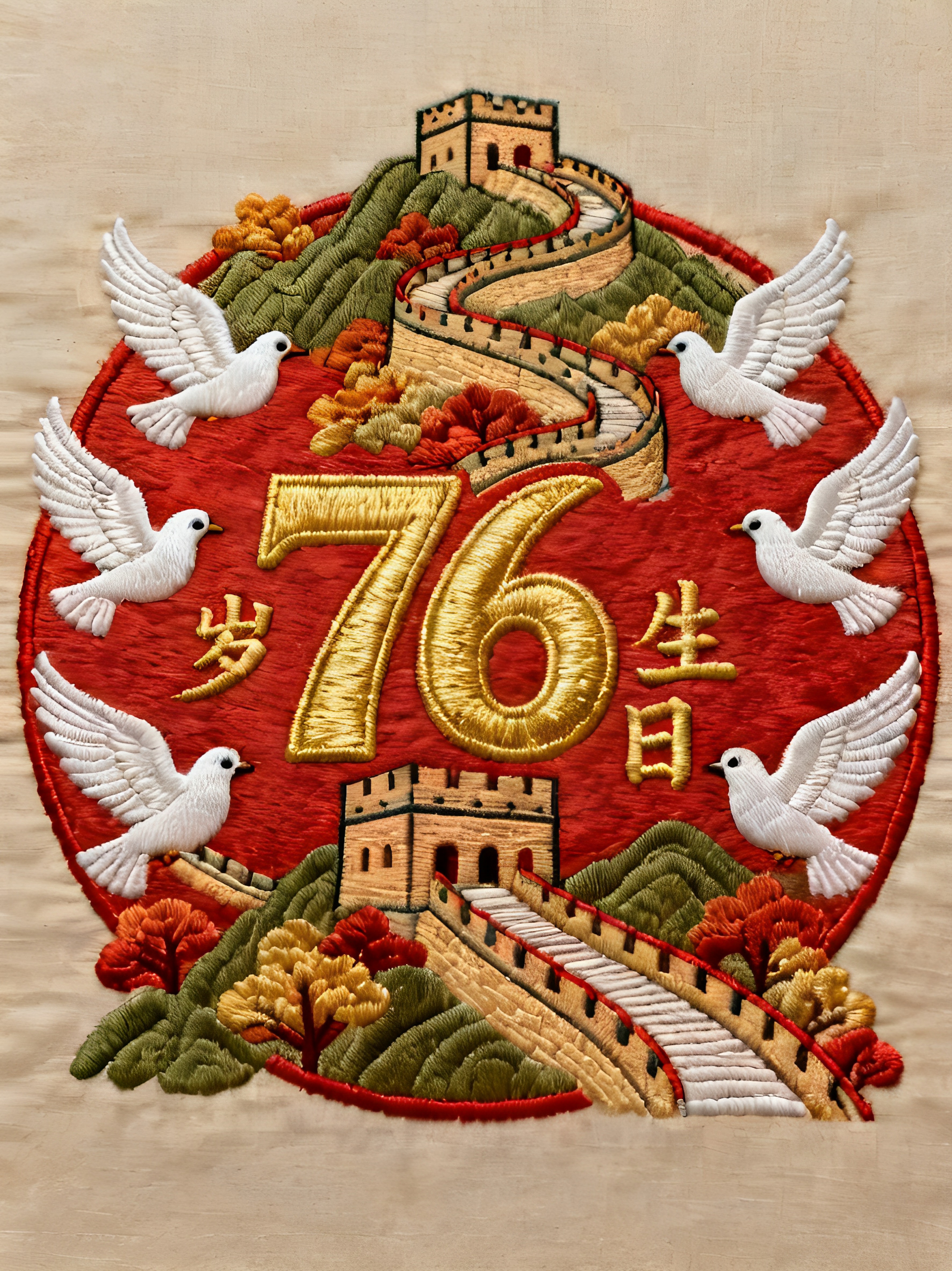 中国传统刺绣艺术,宏伟大气的万里长城蜿蜒在秋意盎然的山峦之间,天空中有数只洁白的和平鸽展翅飞翔,共同环绕着画面中央精美的数字 “七十六华诞” 。数字采用金色盘金绣,闪闪发光。整体配色以中国红、金色和橄榄绿为主,色调辉煌而和谐,洋溢着庄严喜庆的国庆氛围。8K分辨率,细节极致精美。