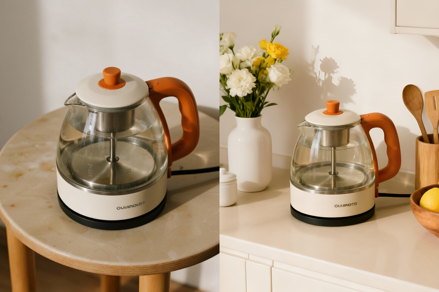 保持参考图产品一致性,产品文字不变,产品细节不变,保留产品主体,产品静置于浅米色厨房台面,厨房场景。厨房整体色调为柔和的米白色,给人一种干净整洁的感觉。产品左侧是一个白色的花瓶,里面插着几朵白色和黄色的花,花瓶旁边还有一个白色的小罐子。台面摆放着花瓶和锅具。产品右侧是一个木制容器,里面装着几件木制餐具,容器旁边是一个木碗,里面装满了柠檬和橙子。木碗的颜色是自然的木色,与厨房的整体色调相得益彰。为画面增添了色彩。背景中可以看到白色的瓷砖墙壁和一扇带百叶窗的窗户,照亮了厨房。整个场景传达出一种温馨、舒适、温馨的氛围,仿佛准备了一顿美味的早餐或下午茶。