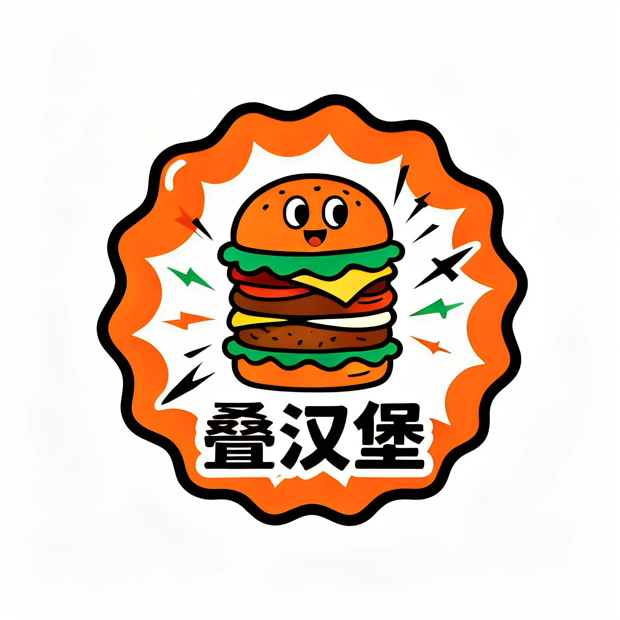 卡通趣味风格logo设计,整体造型为不规则气泡形状,采用活泼的插画风格,致敬设计师Charley Harper。细节元素包括“叠汉堡”的拟人化汉堡角色、层叠食材和动态碰杯符号,色彩明快(橙、绿、白),充满童趣。屡获国际大奖,白色背景。