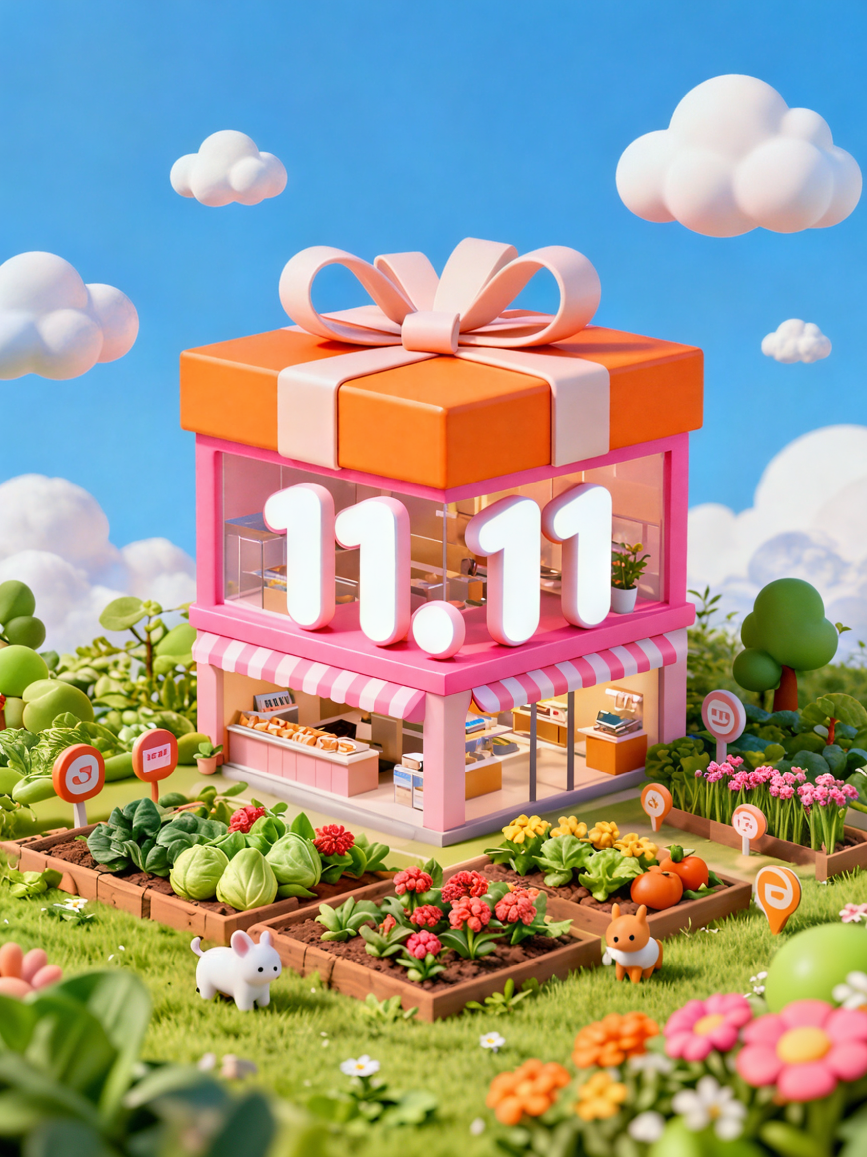 田园风格的城市购物场景,有一个巨大的橙色系着蝴蝶结的礼品盒造型建筑,里面分成好几个商业空间,售卖不同的东西,远处是绿意盎然的3d卡通城市天际线,天空中有飘浮的云朵,色彩鲜艳,细节丰富,4K超高清,画面充满自然与宁静氛围一个动画商店的3D插图,在建筑上面有“11.11”字样,采用可爱的卡通风格,场景包括橙色、粉色和绿色的建筑,与蓝天相映成趣,还有花朵、云朵或人物等俏皮元素。
