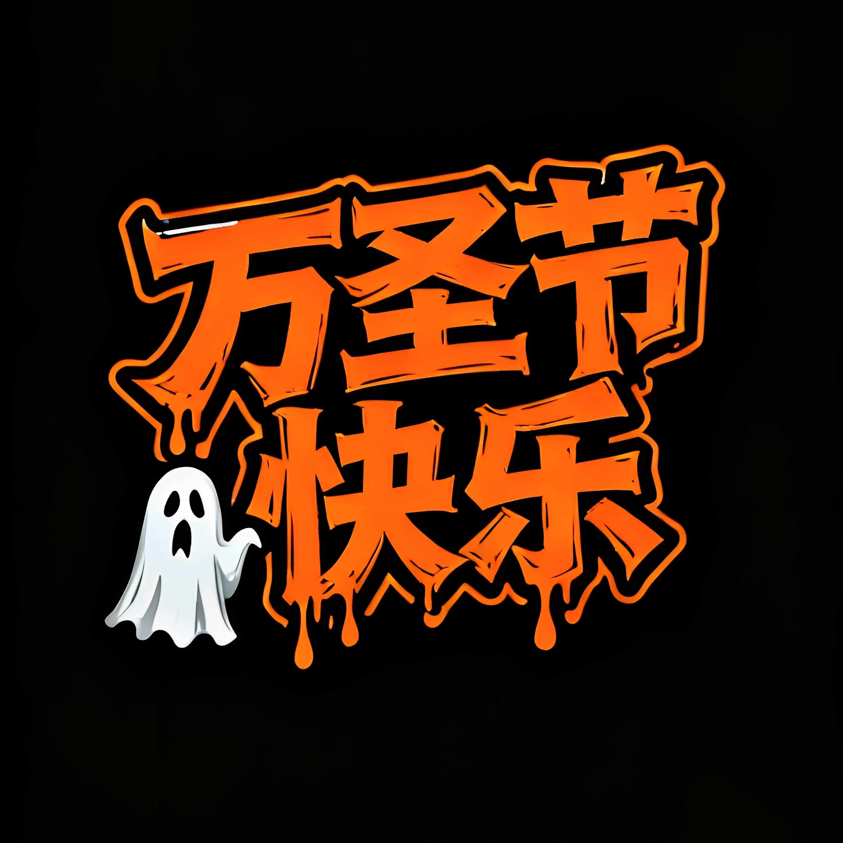 标题字体设计,中文“万圣节快乐”,极具个性和恐怖感的涂鸦字体,橙色字体,跳跃的效果,纯黑色背景,恐怖幽灵在字体旁边装饰。