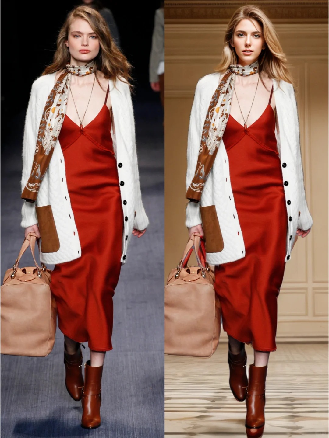 可保持服装不变更换不同肤色、发型的模特。也可上传模特人脸参考,让指定模特穿指定服装。
