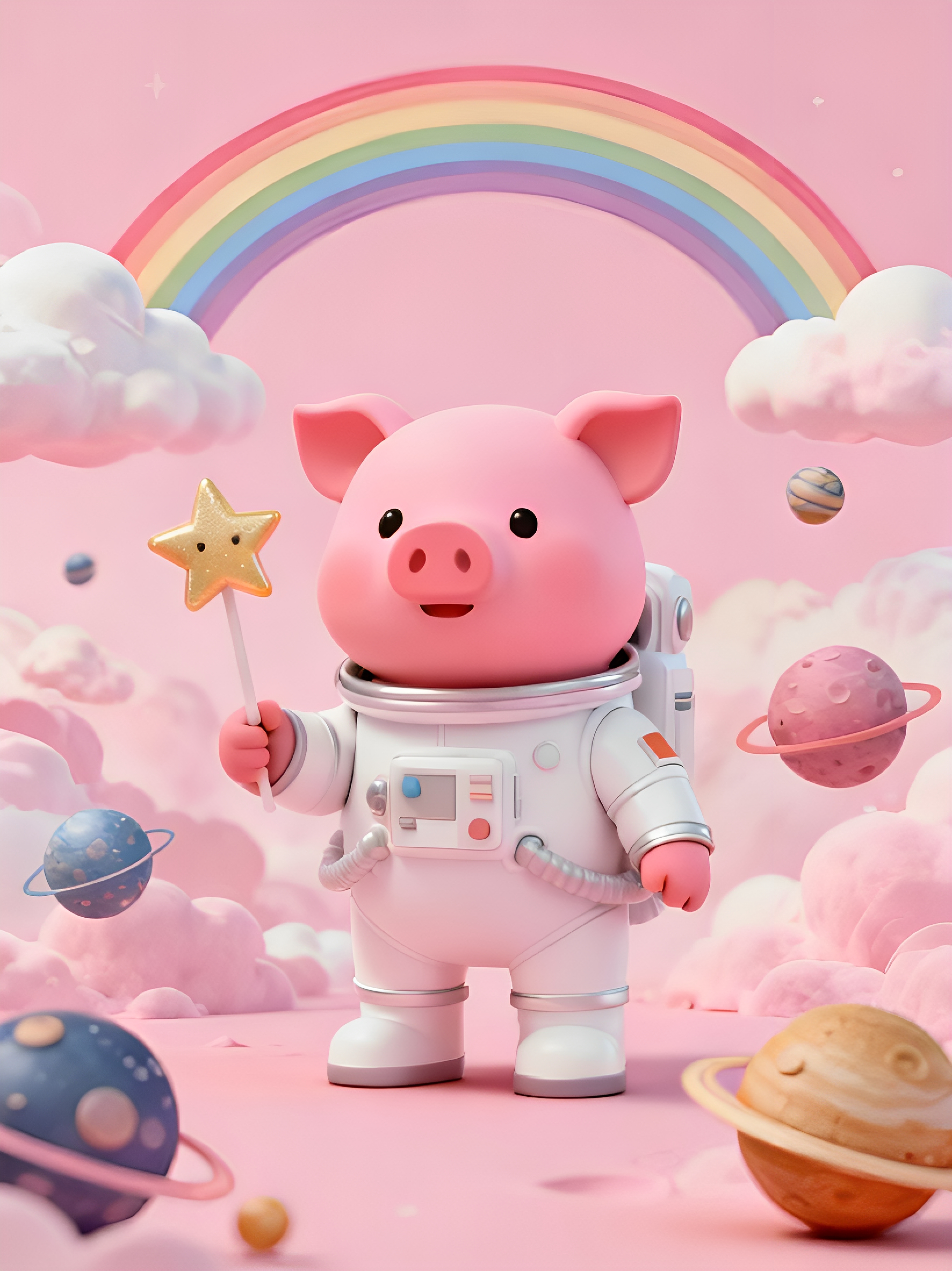 这是一个萌趣的生肖猪形象,3D 建模,微场景,采用柔和明亮的色彩搭配,童趣治愈主题。画面中心是穿着太空服的粉色小猪,手持星星棒棒糖,表情开心呆萌。周围点缀云朵、彩虹与 Q 版星球元素,营造梦幻童趣的氛围。清透粉色系,颜色柔和。