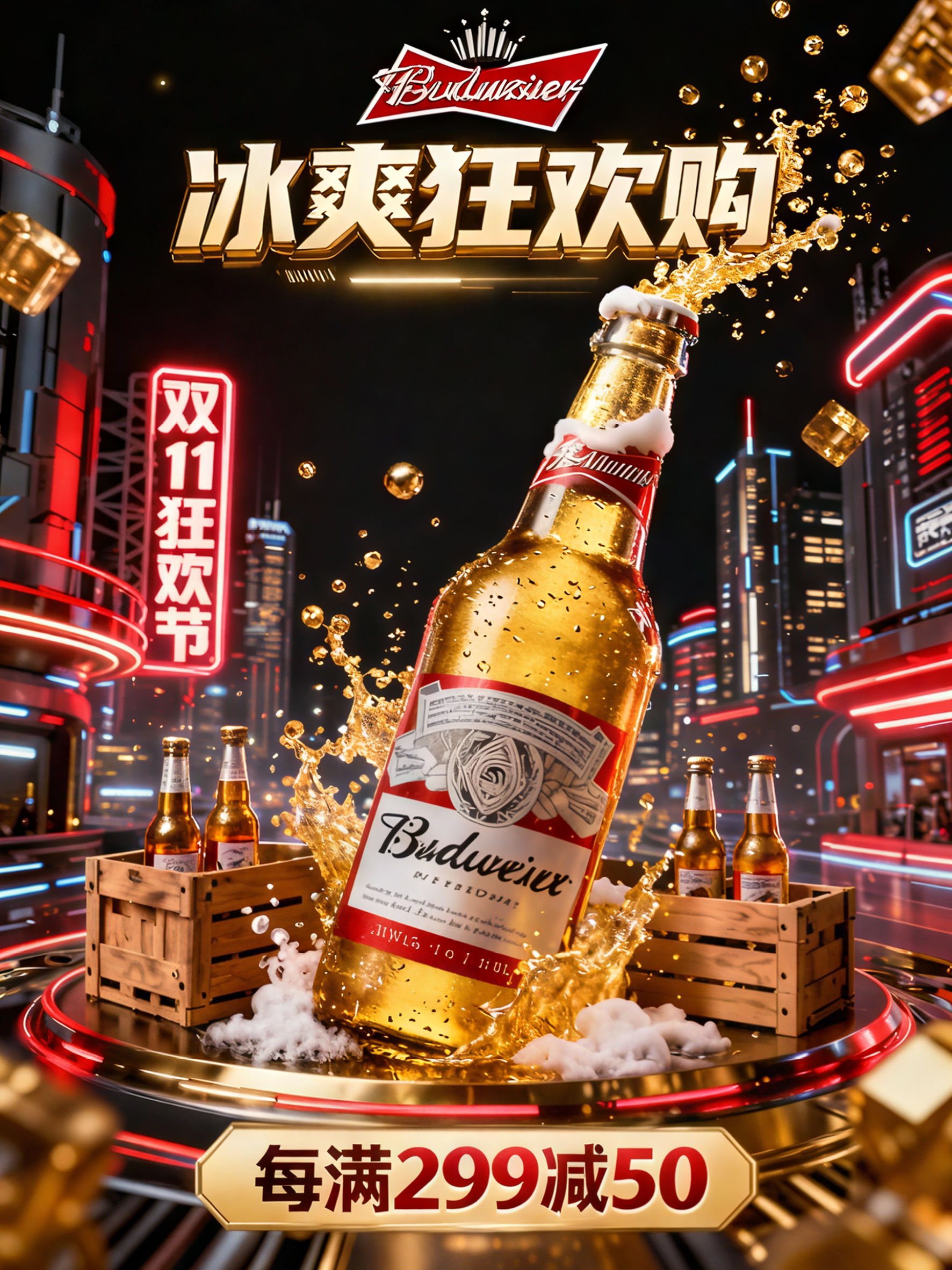 一幅充满动感与节日气息的啤酒双十一促销主题海报。画面中心是一瓶倾泻着金色酒液的巨型百威啤酒瓶,周围飞溅着品莹的泡沫,几罐不同品牌的小瓶啤酒和一个木质酒箱环绕四周。背景是灯火通明的未来都市夜景,高楼上的霓虹灯牌显示“双11狂欢”等字样。构图主体突出,元素环绕。海报上方是醒目的品牌标志和活动主标题“冰爽狂欢购”,下方则有具体的促销信息“爆款直降 每满299减50”。整体色调以深邃的琥珀金和黑色为主,搭配亮眼的红色与金色元素,营造出热烈、时尚且富有活力的狂欢氛围,突出啤酒的清爽与节日的喜庆。